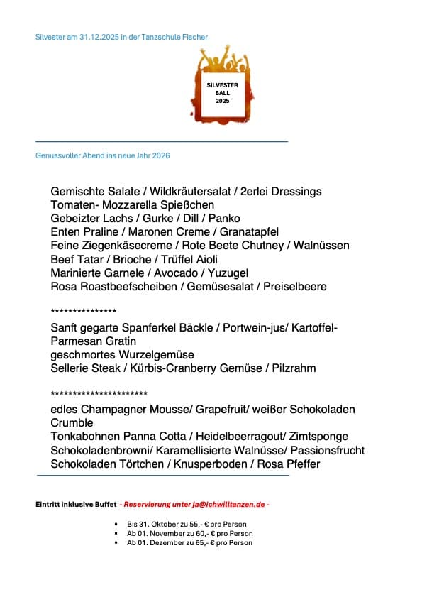 Am 31. Dezember ab 20:00 Uhr erwartet Sie in der Tanzschule Fischer ein Abend voller Spannung, Tanz und guter Laune.